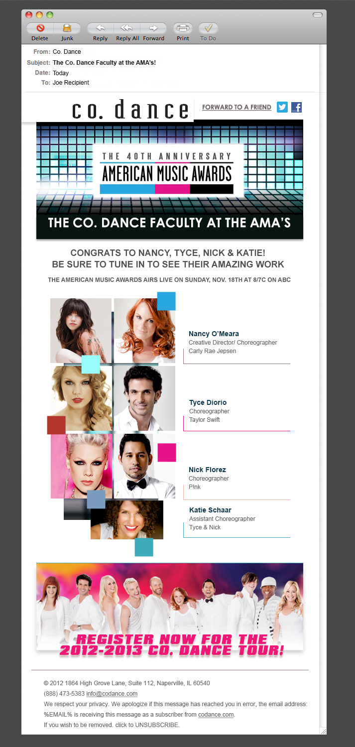 Email inviting people to view the AMA's. This email was designed to take advantage of that first instant the email is open and images are loaded. The large graphic fits well above the fold and almost all text is HTML and stylized to fit well and look accurate in a wide range of email software. Co.Dance is a collection of some of the best dancers and choreographers in the world.