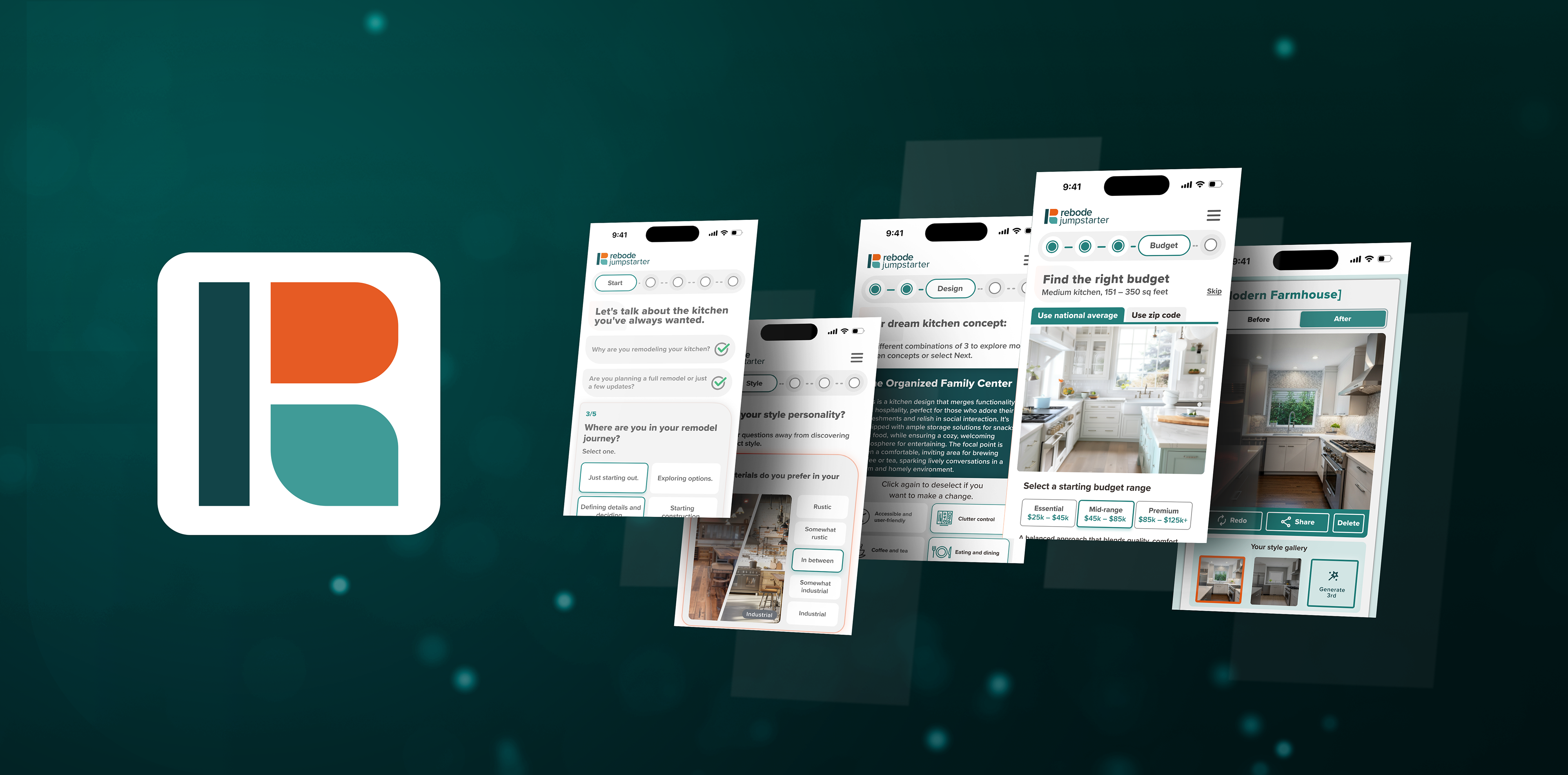 Presentation view of the Rebode Jumpstarter experience as mobile screenshots floating on a brand color abstract bokeh visual background along with the Rebode logo in an icon format.