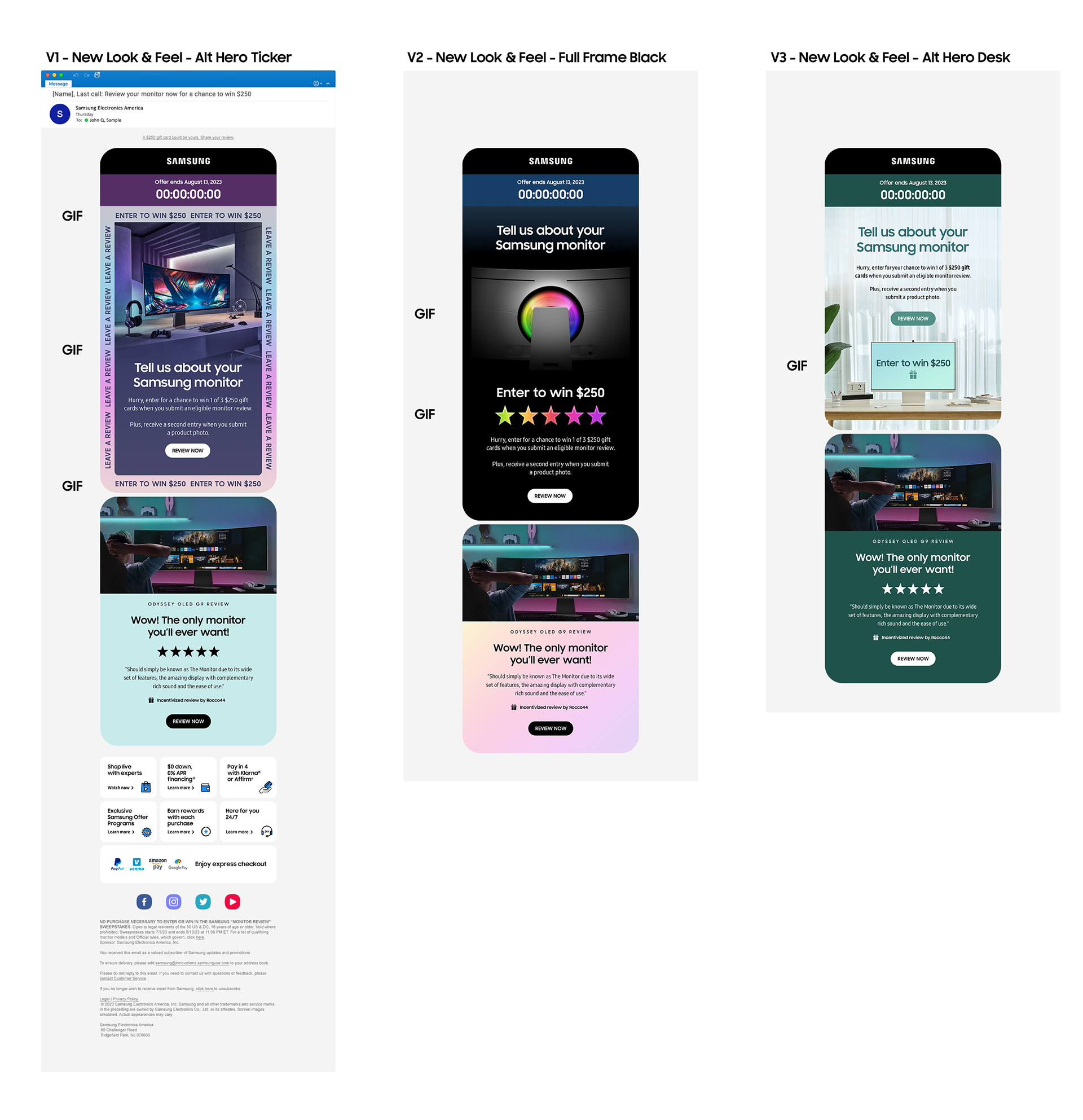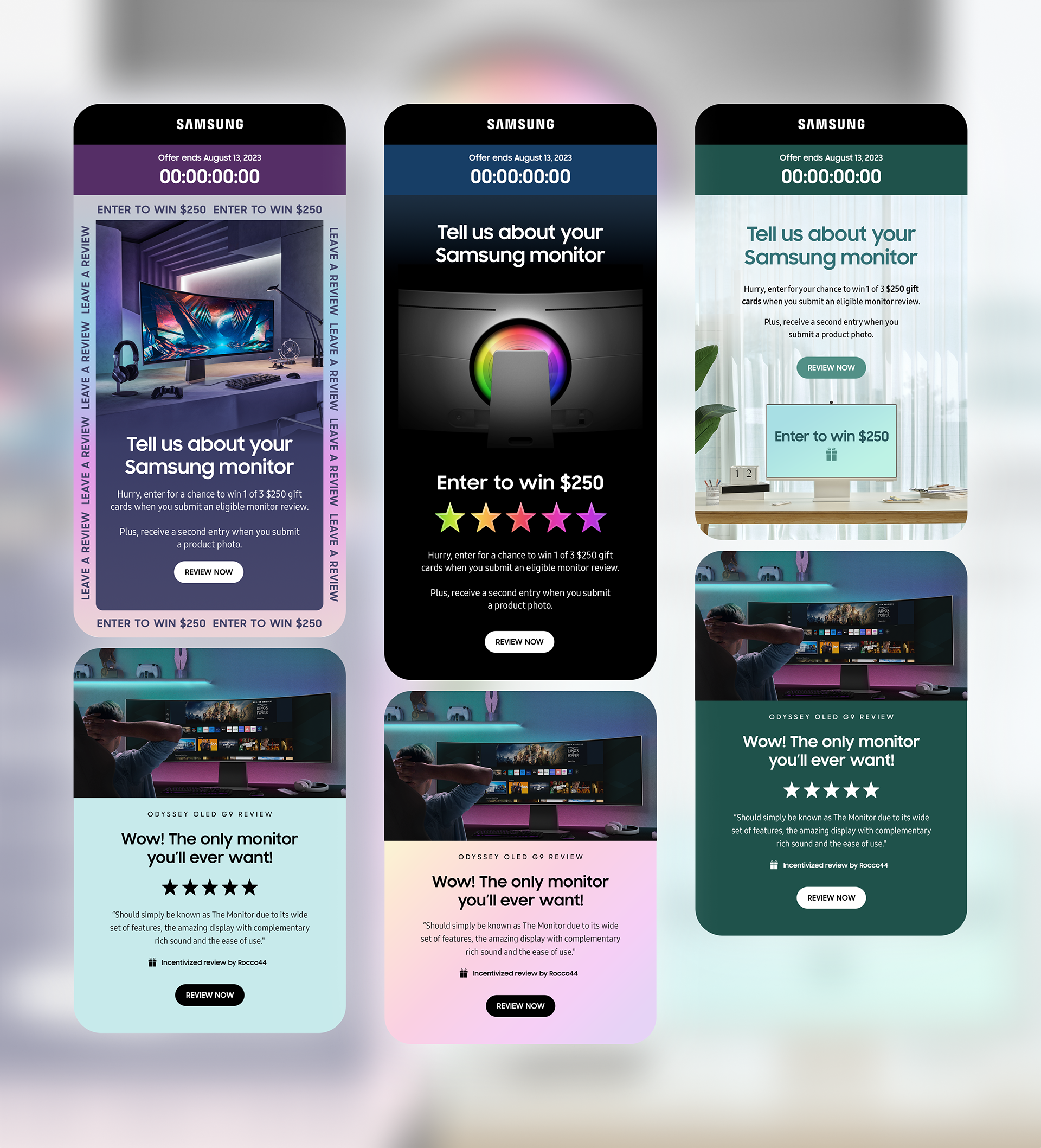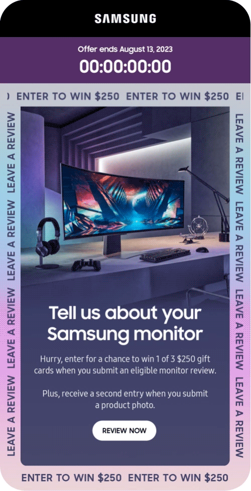 Special set of high reach email broadcasts. The target was recent purchasers of Samsung monitors. These looks varied across potential owners. The visuals would be AB tested against a more standard general version (not shown). A large part of the intent is to boost the engagement of recipients leaving review and ideally positive reviews. Inclusion of a countdown timer, animated GIFs, chance to win money, and high quality imagery aligned to the owner's purchased monitor helped drive a prospective open rate of 20% along with a .34 CRV.